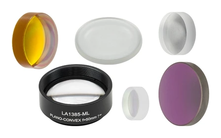 Сферические линзы Thorlabs доступны в плоских, вогнутых и выпуклых конфигурациях на подложках N-BK7, UV fused silica, N-SF11, ZnSe, CaF₂ и Si. Есть широкополосные AR-покрытия для УФ, видимого, ближнего и среднего ИК диапазонов.